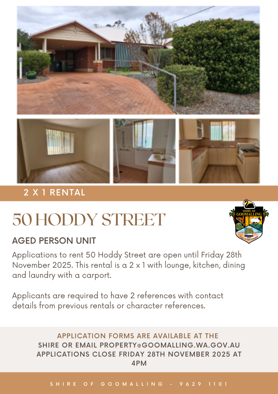 Expressions of interest are invited to purchase the respective properties. EOI are to be addressed to the Chief Executive Officer, PO Box 118, Goomalling WA 6460, with settlement date being jointly agreed between relevant parties and Council and subject to Council complying with Section 3.58 (3) of the Local Government Act 1995.
